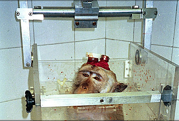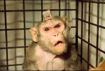 Diesen Tieren wurde auf dem Schädelknochen eine Art von Adapterstecker montiert. Über diesen Adapterstecker werden Mikroelektroden (extrem feine Nadeln) angeschlossen, die in verschieden Bereiche des Gehirns eingeführt werden. Die Forscher versuchen dann mit diesem sogenannten elektrophysiolgischen Verfahren, durch Abtasten des Erregungszustandes einzelner Nervenzellen mit Hilfe von diesen Mikroelektroden herauszufinden, welche Hirnregionen bei welchen Funktionen mitwirken und nach welchen Prinzipien die Nervenzellen in den betreffenden Arealen die spezifischen Leistungen erbringen. Umgekehrt werden nacheinander schwache elektrische Signale an diese Mikroelektroden angelegt. Damit werden ausgewählte Bereiche des Gehirns gezielt elektrisch gereizt und es wird beobachtet, welche Reaktionen das bei dem Versuchstier hervorruft. Durch diese Reizungen können z.B. verschiedene Gemütslagen des Tieres wie z.B. Aggression, Trauer, Schlafbedürfnis und andere ausgelöst werden, Beeinträchtigung der Sinne wie z.B. das Seh- Hör- Tastvermögen, es können Fehlfunktionen, Phantomschmerzen und eine Vielzahl anderer Reaktionen sein, die damit erzeugt werden. Man versucht damit die Funktion des Gehirns zu verstehen. Bei solchen Versuchen wird schon seit vielen Jahrzehnten in den Gehirnen der Versuchstiere herumgestochert. Diese mittelalterliche, tierquälerische “Forschung“ bringt für den Menschen keinen Nutzen und ist nur durch die Finanzierung durch unsere Steuergelder möglich! Es bringt nur den Menschen einen Gewinn, die in diesen Bereichen “arbeiten“. Diese, mit ihren Doktortiteln in ihren weißen Kitteln behaupten, dass diese Versuche von hohem wissenschaftlichen Nutzen sind. Damit wollen diese nur ihre hoch bezahlten Stellen rechtfertigen und sichern. Wer sägt schon den Ast ab, auf dem er sitzt? Erkenntnisse über die Funktion des menschlichen Gehirns wurden durch die Untersuchung von Menschen, die durch einen Schlaganfall oder Unfall schwere Schädel- bzw. Gehirnschäden erlitten haben, gewonnen. Damit wurde herausgefunden wo die Zentren für das Sehen, Sprechen, der Motorik und anderes liegen. Auch beim gesunden Menschen kann mit Hilfe der Kernspin-Tomografie-Technik absolut schmerzfrei und ohne Schäden zu verursachen das Gehirn erforscht werden. Diese Technik wurde immer weiter verfeinert. Durch die Beobachtung von Temperaturunterschieden (dort wo die Temperatur erhöht ist, ist auch eine erhöhte Aktivität) und Verfolgung von elektrischen Signalen durch das Wirrwarr von Nervenzellen und den verbindenden Schaltpunkten (Synapsen) können schon fast einzelne Gedanken im menschlichen Gehirn verfolgt werden. Bitte schauen Sie sich auch die Fotoreihe mit erklärendem Text auf der Seite der „Vereinigung Ärzte gegen Tierversuche e.V.“ zum Thema Hirnforschung an: klicken Sie hier Oder auch die sehr informativen Videos. |
